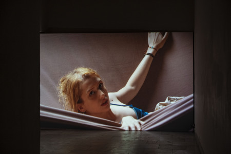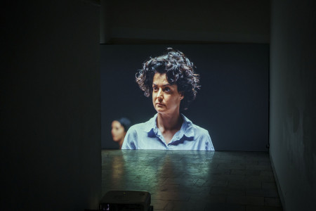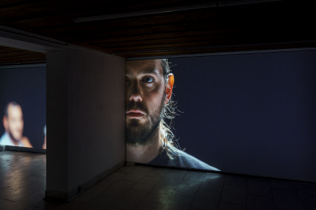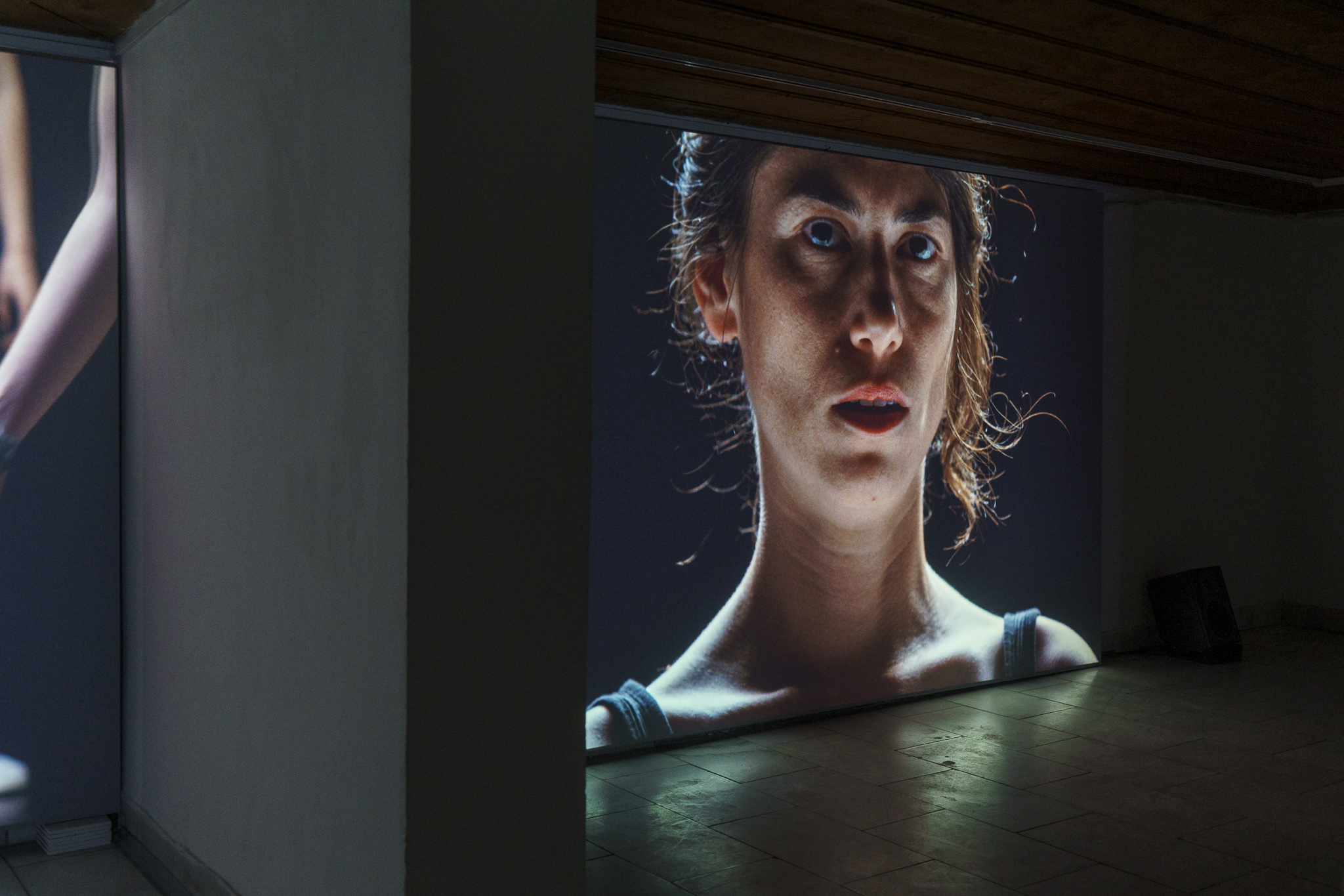 The work is made up of three synchronized projections and a common sound. It is installed in a space with intermediate walls that delineate 3 separate parts. There is a common view to all of them from certain points. The action moves from one projection to the other, passing through the walls. They create visual barriers which are overcome by the search for connectivity between the individual frames against the background of the overall composition.