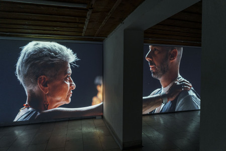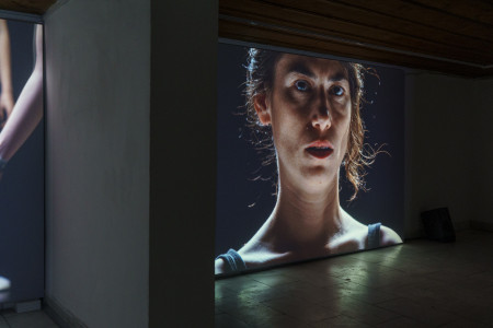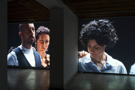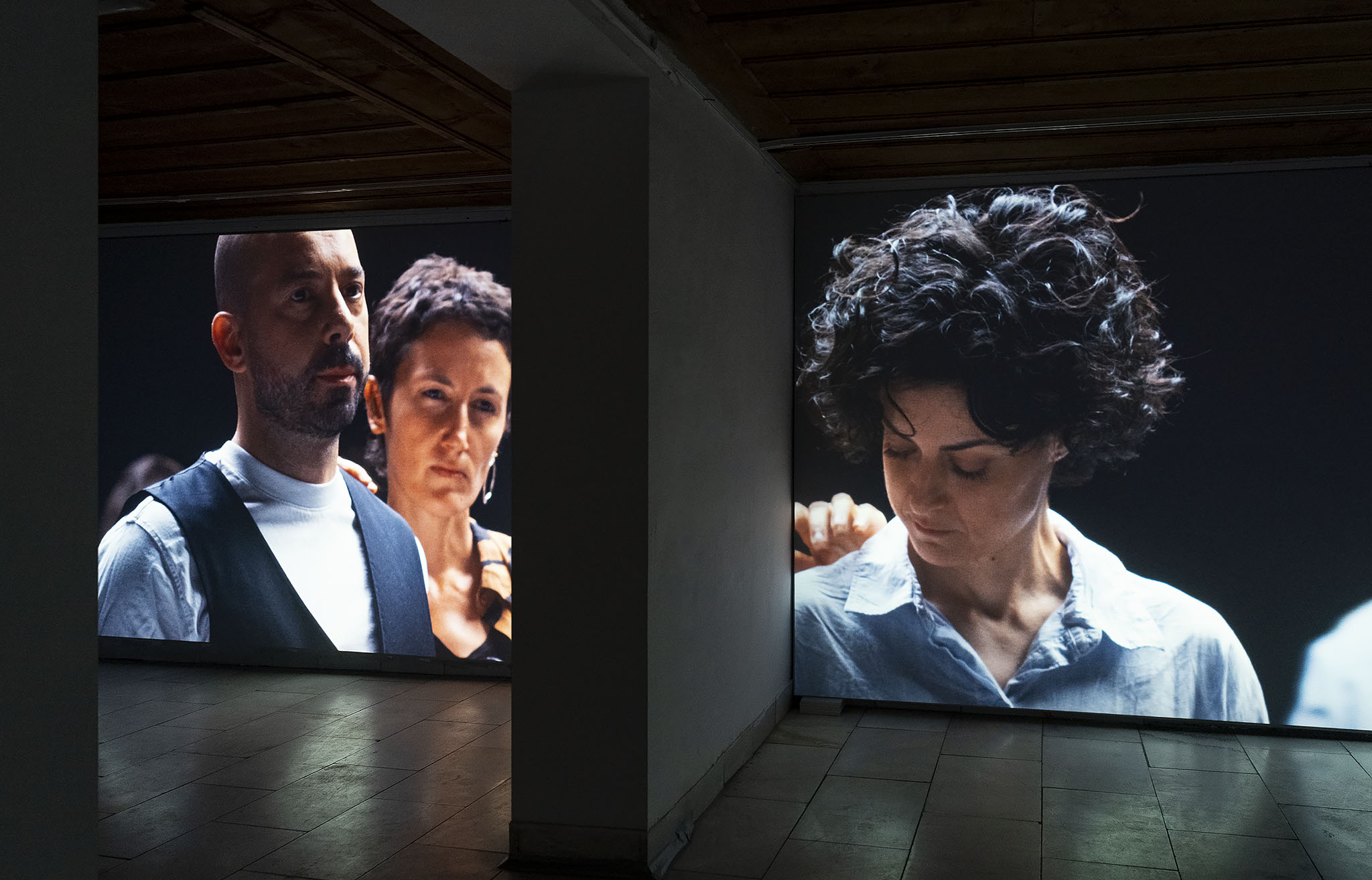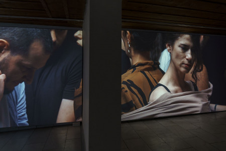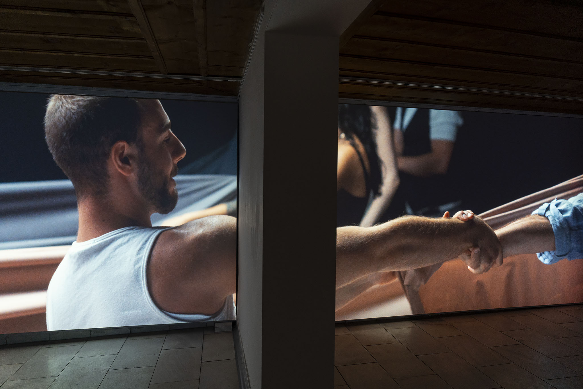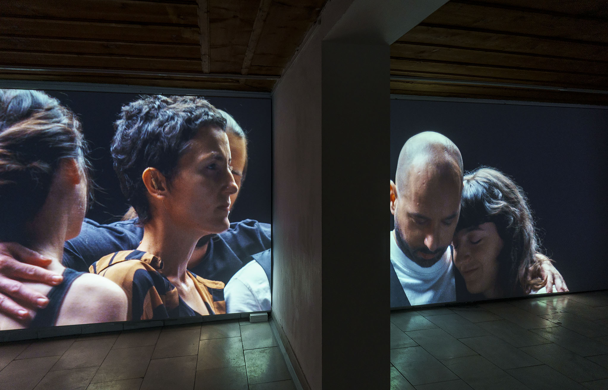 The shots are filmed on stage with 14 participants, non-professionals at different ages, trying to engage with each other through grasping, through touching and converging. Something that at times looks like a rehearsal without dramaturgy, at times gives the impression of a search for concrete action. The scenes unfold between the three screens, the aim being to create the sense that the spaces in between and the projections far apart from each other are in fact the obstacles in the context of the overall action.