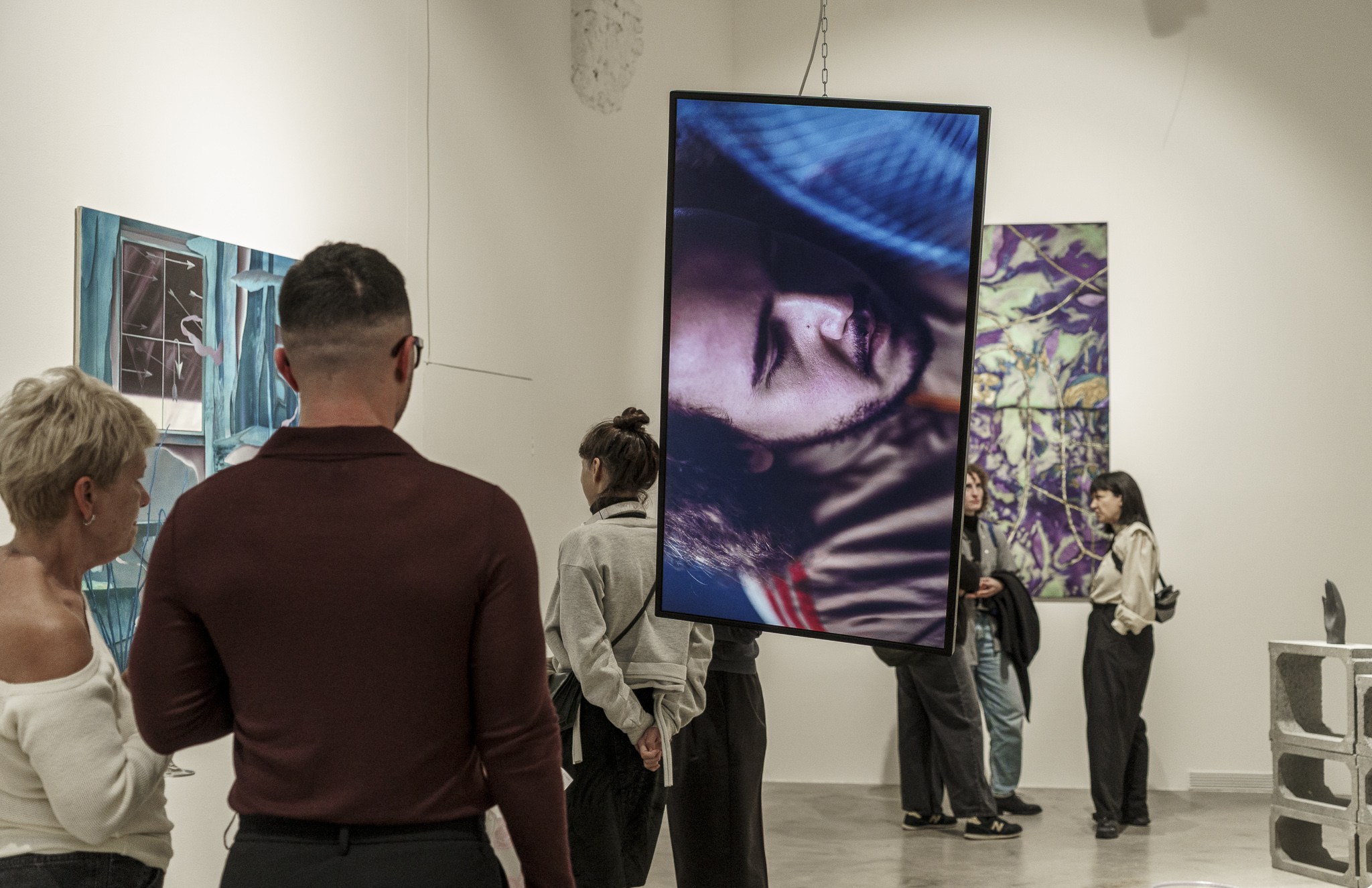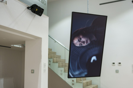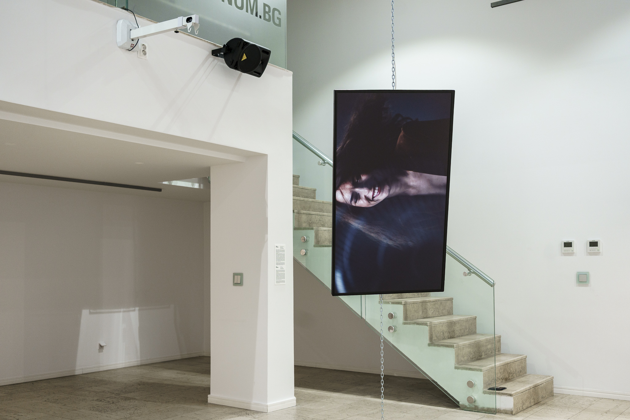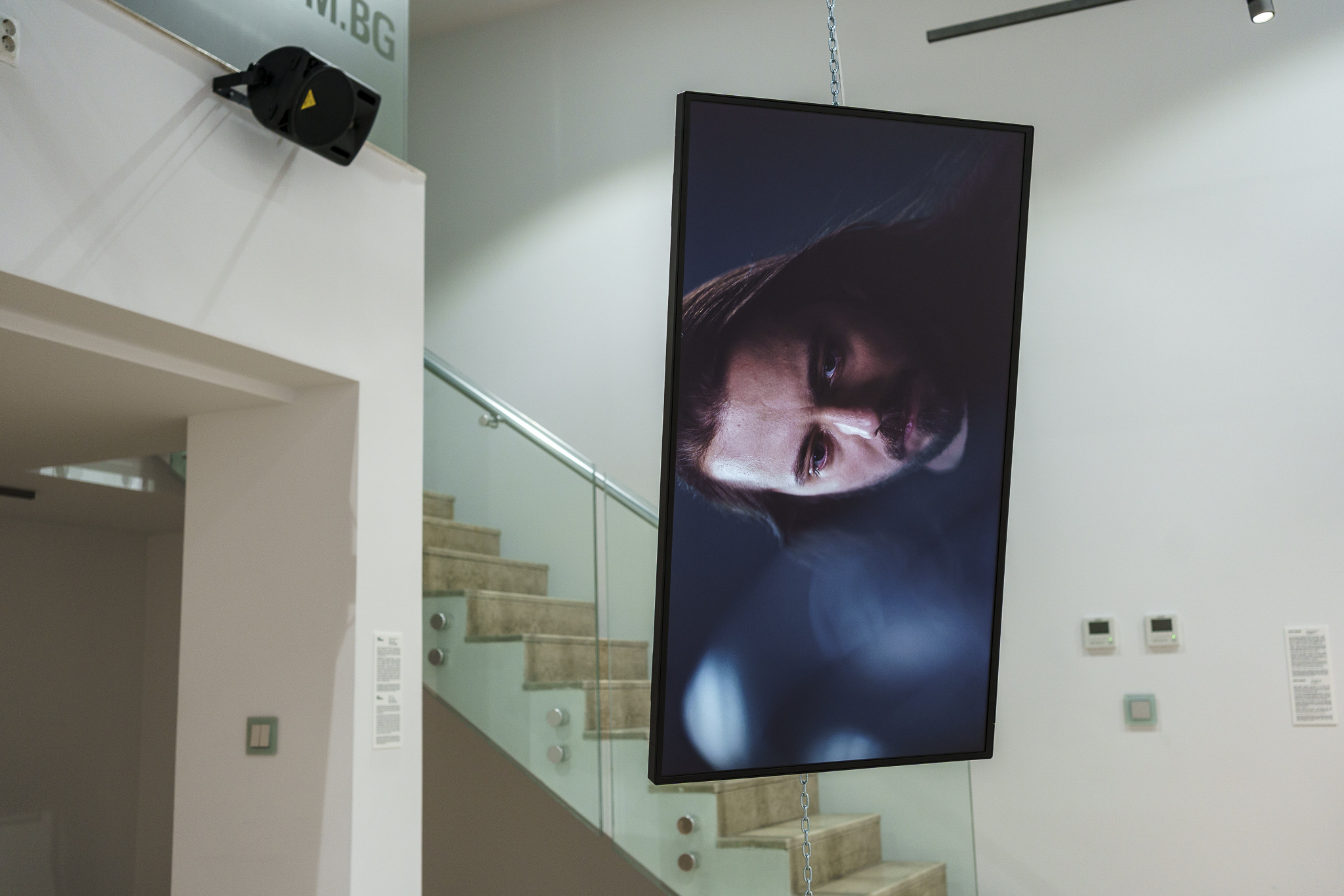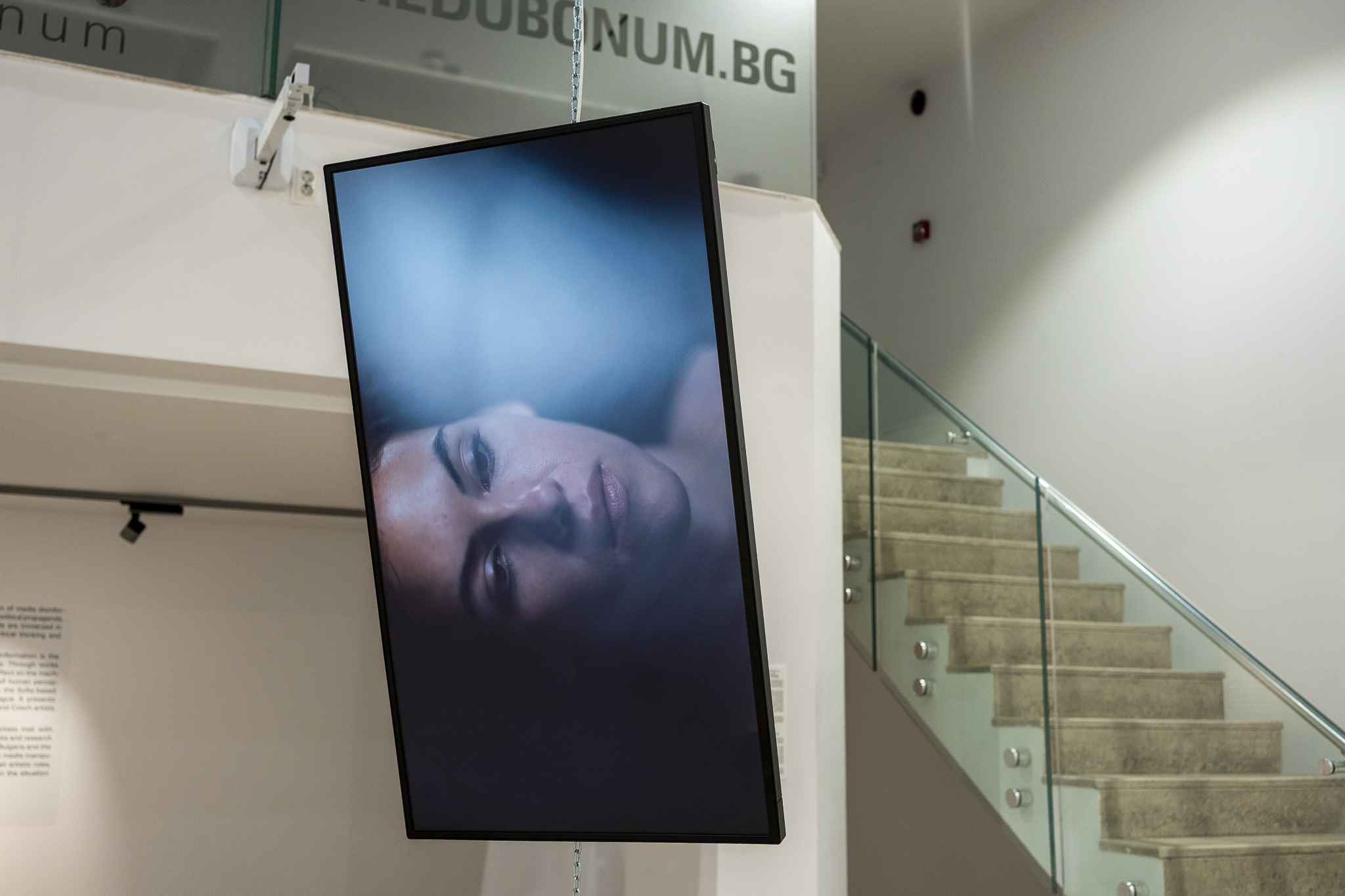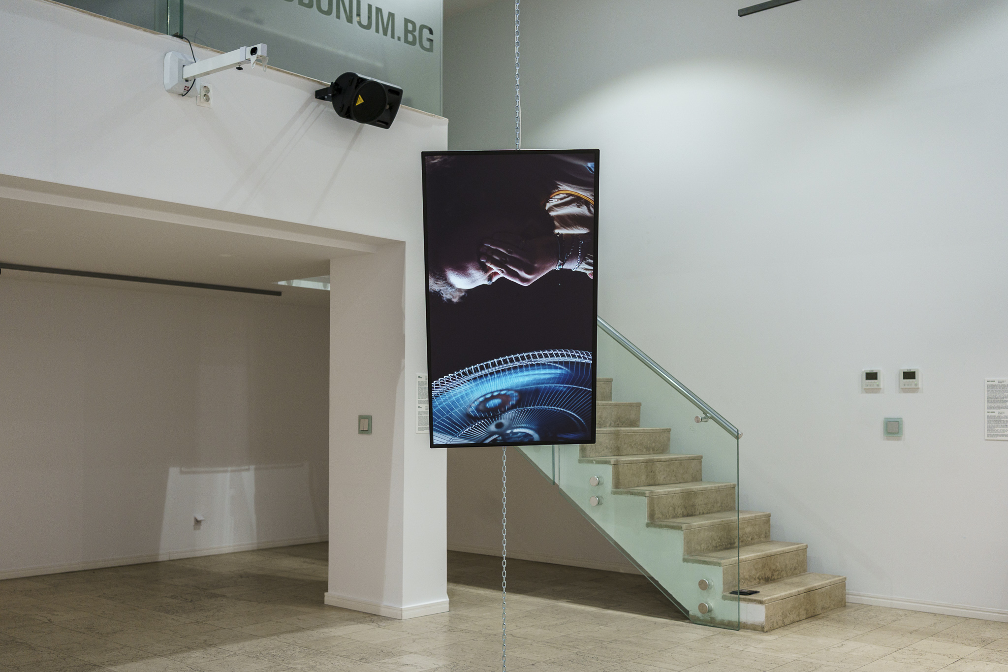 The work is installed on a monitor hanging vertically from the ceiling. It sways slightly with the movement of the air. This reinforces the specific feeling of weightlessness, of levitation, of a lack of sense of time, which is very characteristic when standing in front of screens. They are the surface that separates the forms of experience and engulfs us completely in the field of the short and the immediate. The screen is like a sticker that blurs the view and scatters visual noise, aggressive, impersonal, often annoying but always obsessive and at the same time quite dangerous.