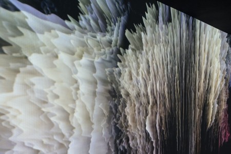 The video work "Displace (no wig, no lipstick, no phone and no cigarettes)" develops associations and transforms it into the 3D space. It is precisely such kind of distancing and disrobing the image – it is devoid of substance and morphs into colorful, abstract three-dimensional curves and linear mutations that are indicating movement, time and space. That demolishes the original video material entirely while creating a new image with new impact.